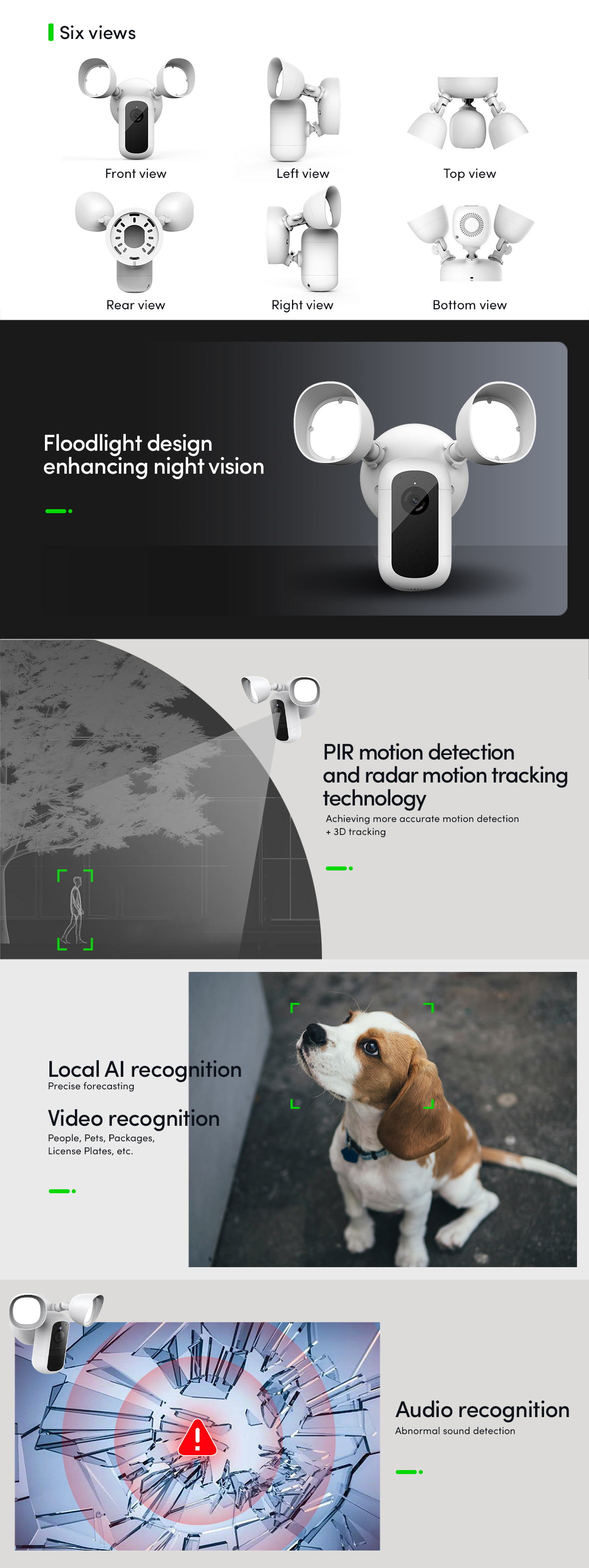 It can be used for outdoor monitoring and lighting, and the addition of lights not only improves the night vision ability of the monitoring, but also acts as a deterrent to intruders. PIR motion detection and radar motion tracking technology can work together to capture subtle object changes. Local AI can greatly improve the recognition ability of the camera.